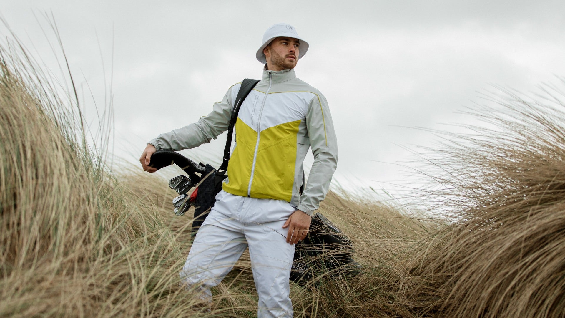 Golfer swinging his dryvr club. He is wearing navy and red golf rain jacket, and a water proof golf cap