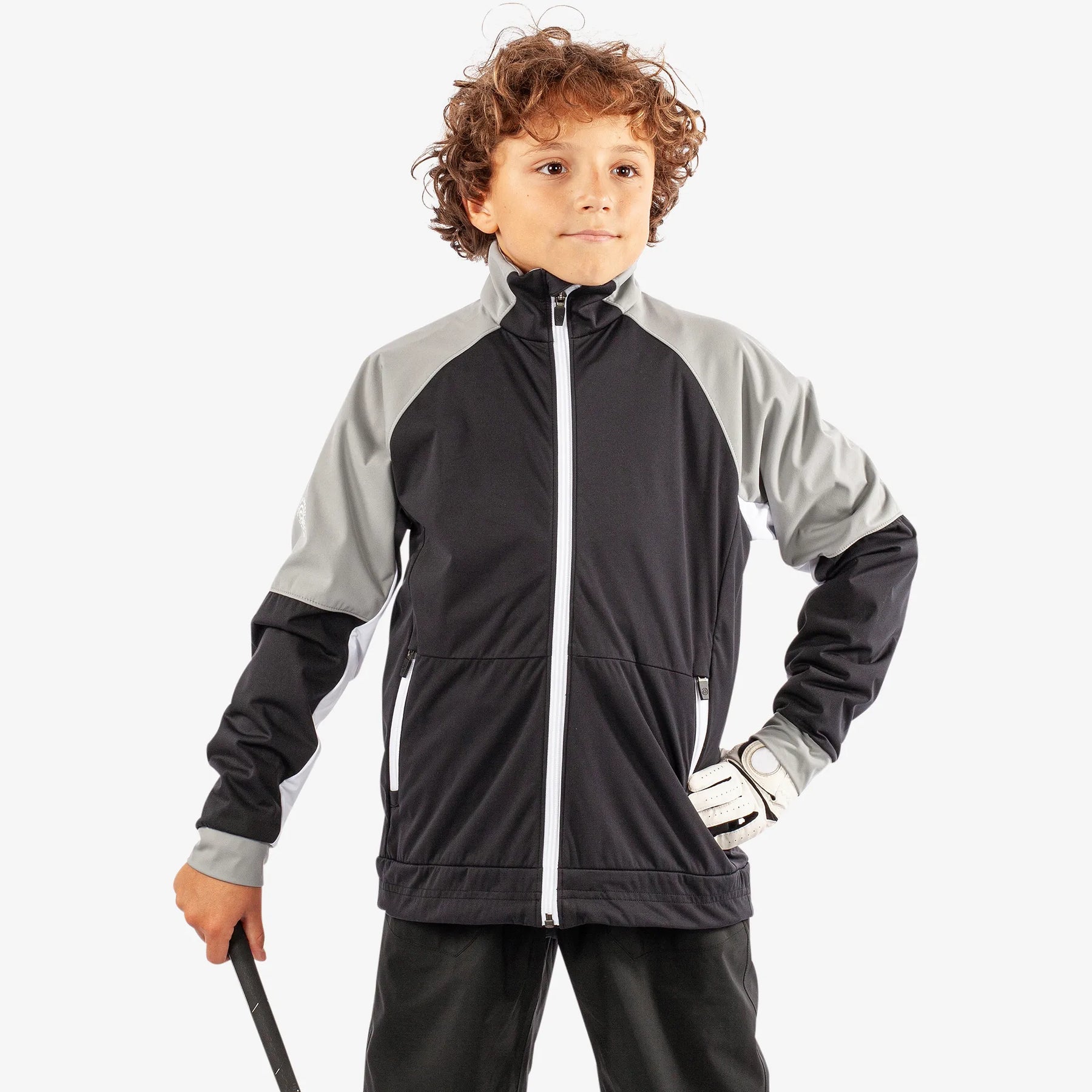Remi is a Windproof and water repellent golf jacket for Juniors in the color Black/Sharksin/White(10)