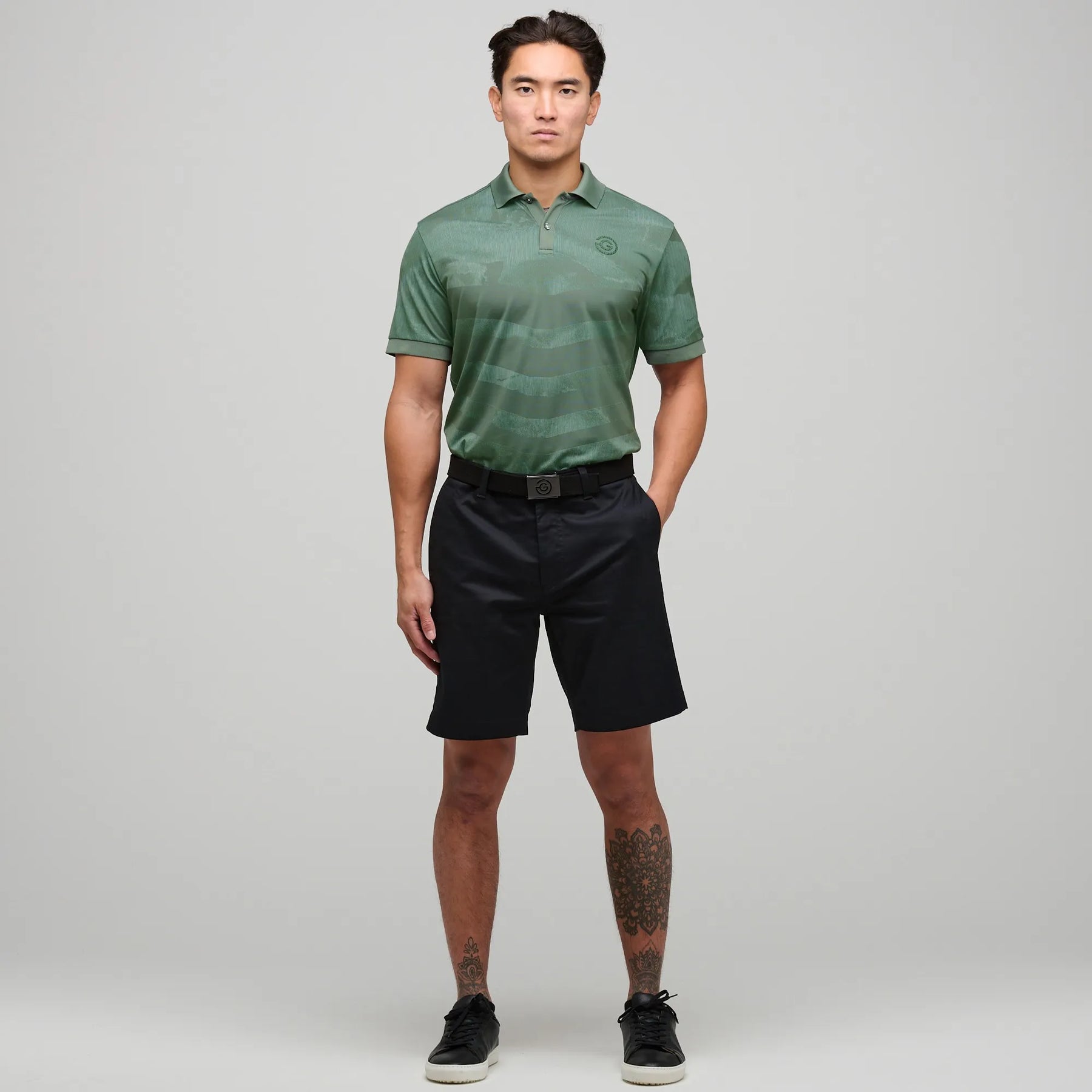The Perry shorts offer UV protection 15+ and feature chino and back pockets, with a comfortable 9-inch inseam for versatile wear on the golf course or in everyday life.