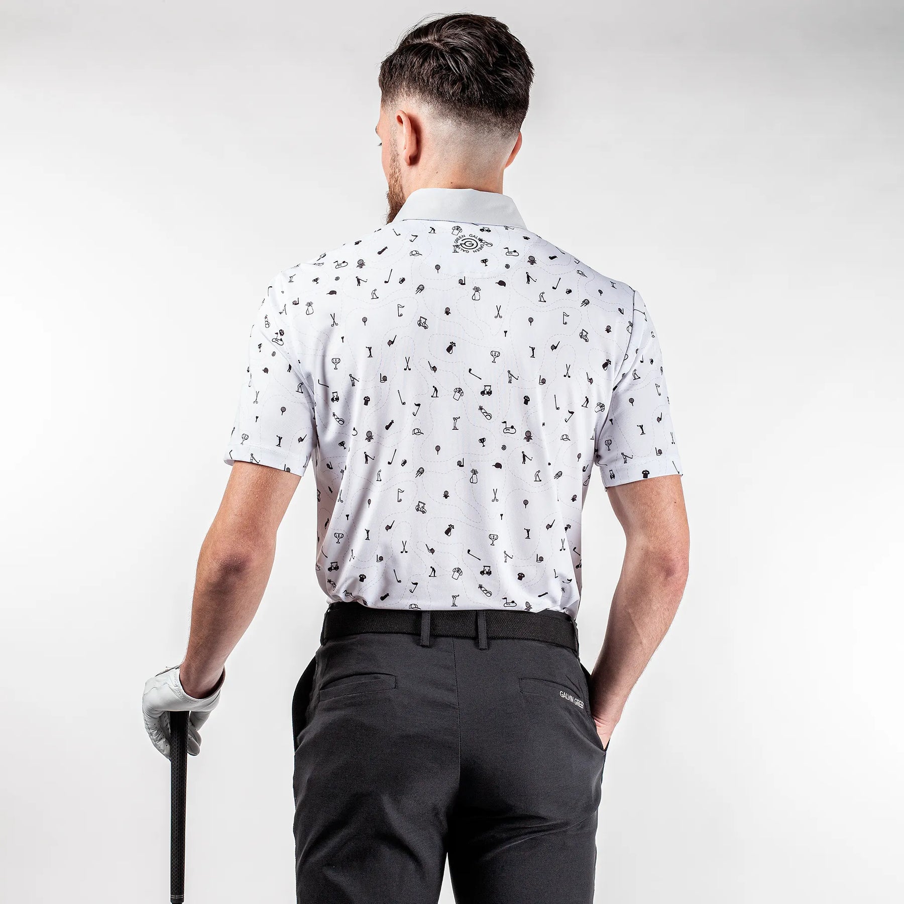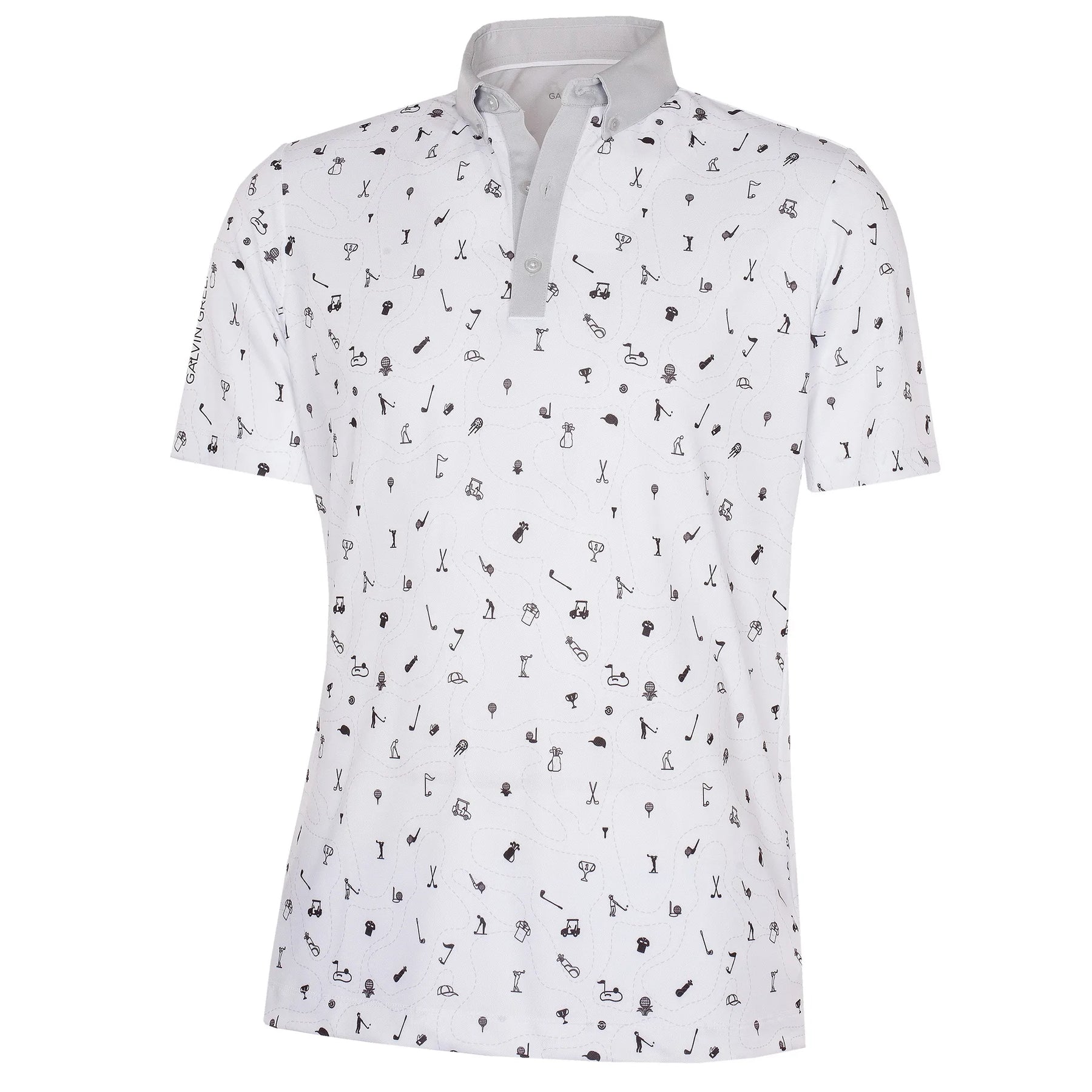 Miro is a playful men’s golf shirt with a small scale golf themed print. Made from an extremely breathable VENTIL8™ PLUS fabric, this shirt’s UV factor of 20+ offers light sun protection, while being quick dry to ensure you are comfortable on a hot day. Made from a soft, stretchy fabric, Galvin Green’s high tech polo shirts are tested on the golf course for functionality and comfort..