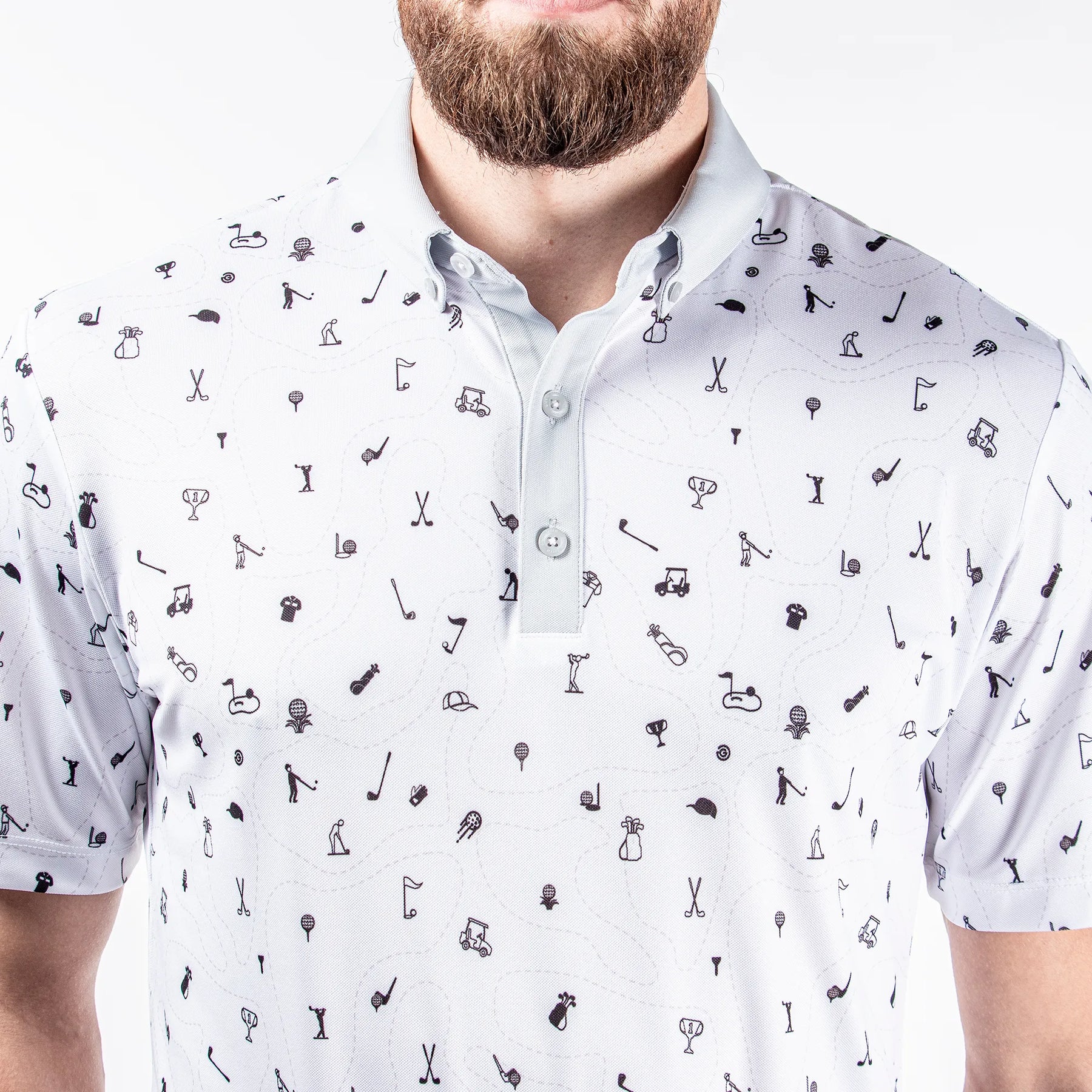 With small icons of golf clubs, carts, golfers, and more, this playful men’s golf shirt is as fun as it is functional. Features include a tailored collar and open sleeve cuffs. Colour contrasts: The following colours have a black contrast: Forged Iron and Red. The following colours have a navy contrast: Cool Grey and Orange.