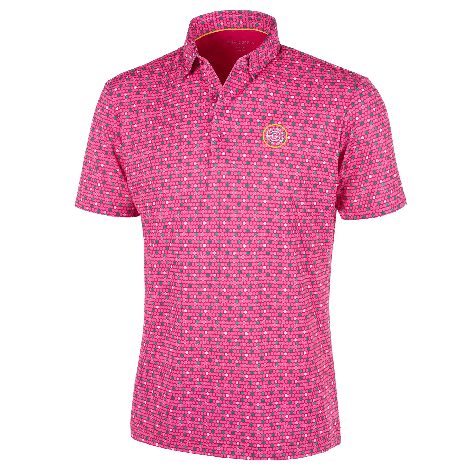 Moore is an all over print golf shirt inspired by the botanical gardens of legendary golf courses. With a small scale circular all over print in tones of grass green or fuschia pink, this stand out shirt is designed to make a statement on the golf course. Made from Galvin Green’s VENTIL8™ PLUS fabric, you’ll find this shirt to be extremely breathable and quick dry, making it comfortable to wear on the hottest of days.
