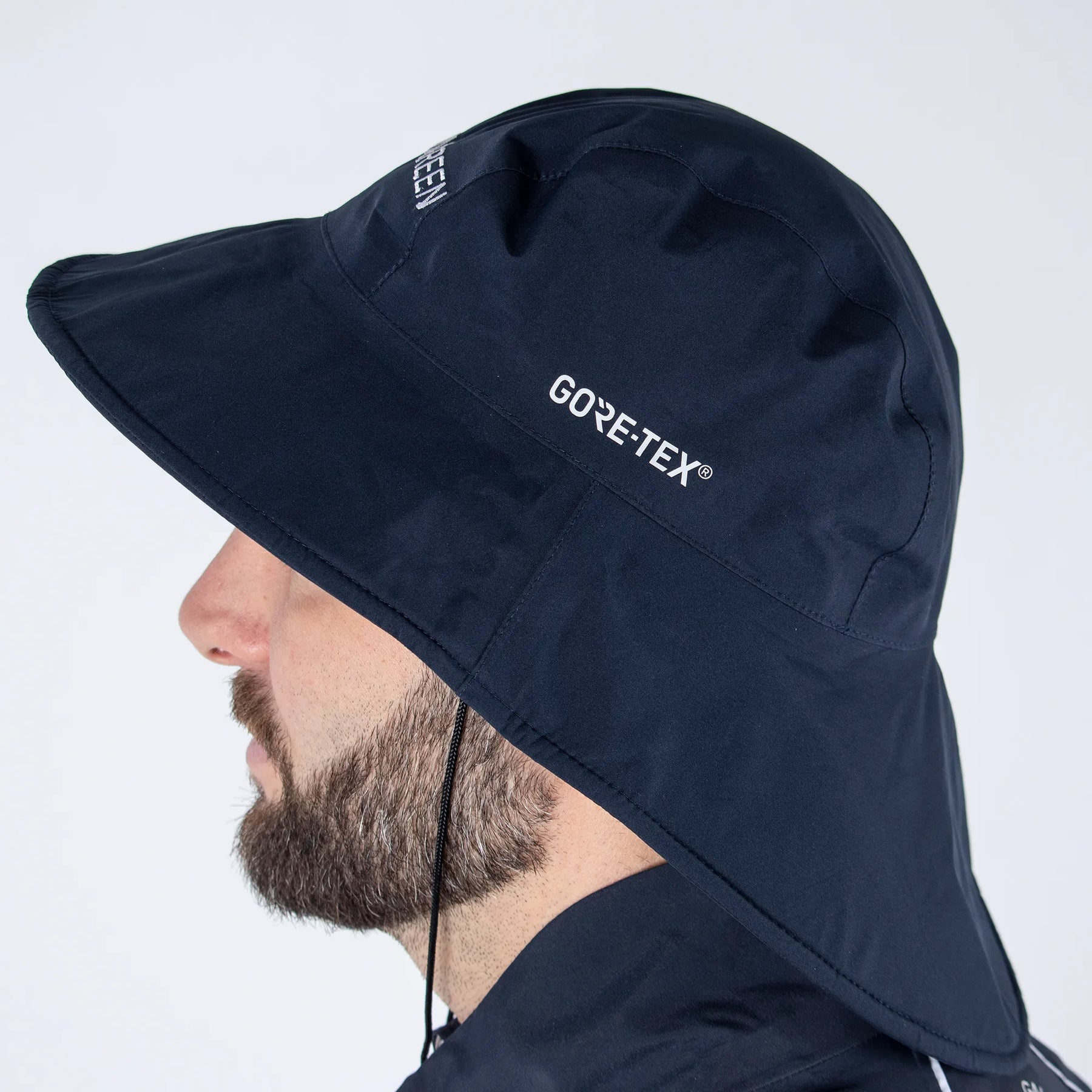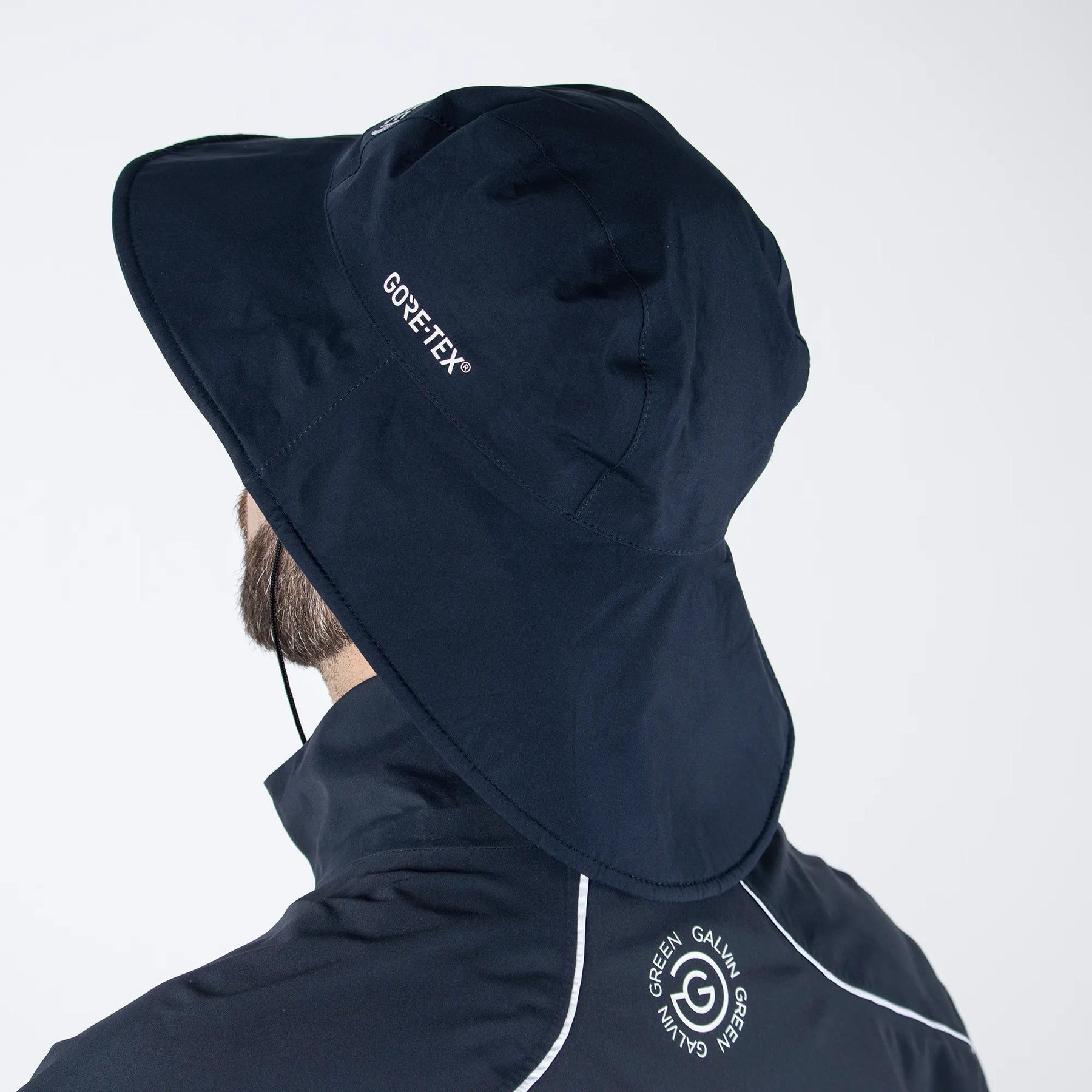 Fully seam-sealed GORE-TEX golf hat with extra wide brim at the back, storm strap and elasticated sweatband for maximum protection and comfort.