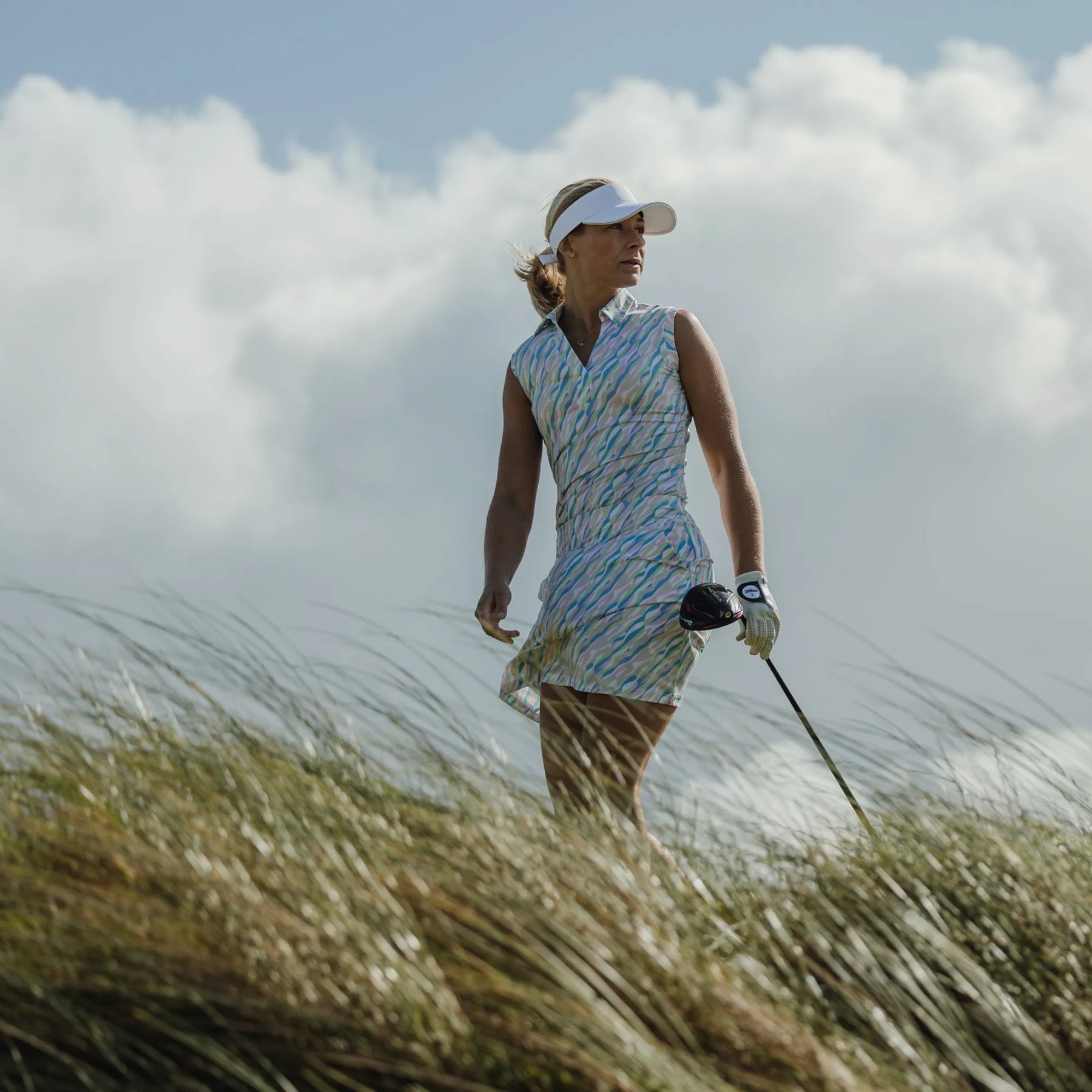 The Melissa shirt's print features angled geometric argyle shapes inset with curving lines reminiscent of the soft meadows of a golf course. Made from stretch fabric, it offers exceptional breathability and quick-drying comfort, keeping you fresh throughout the day. With UV protection (20+) and a tailored v-neck collar, this shirt combines style and performance for the modern golfer.