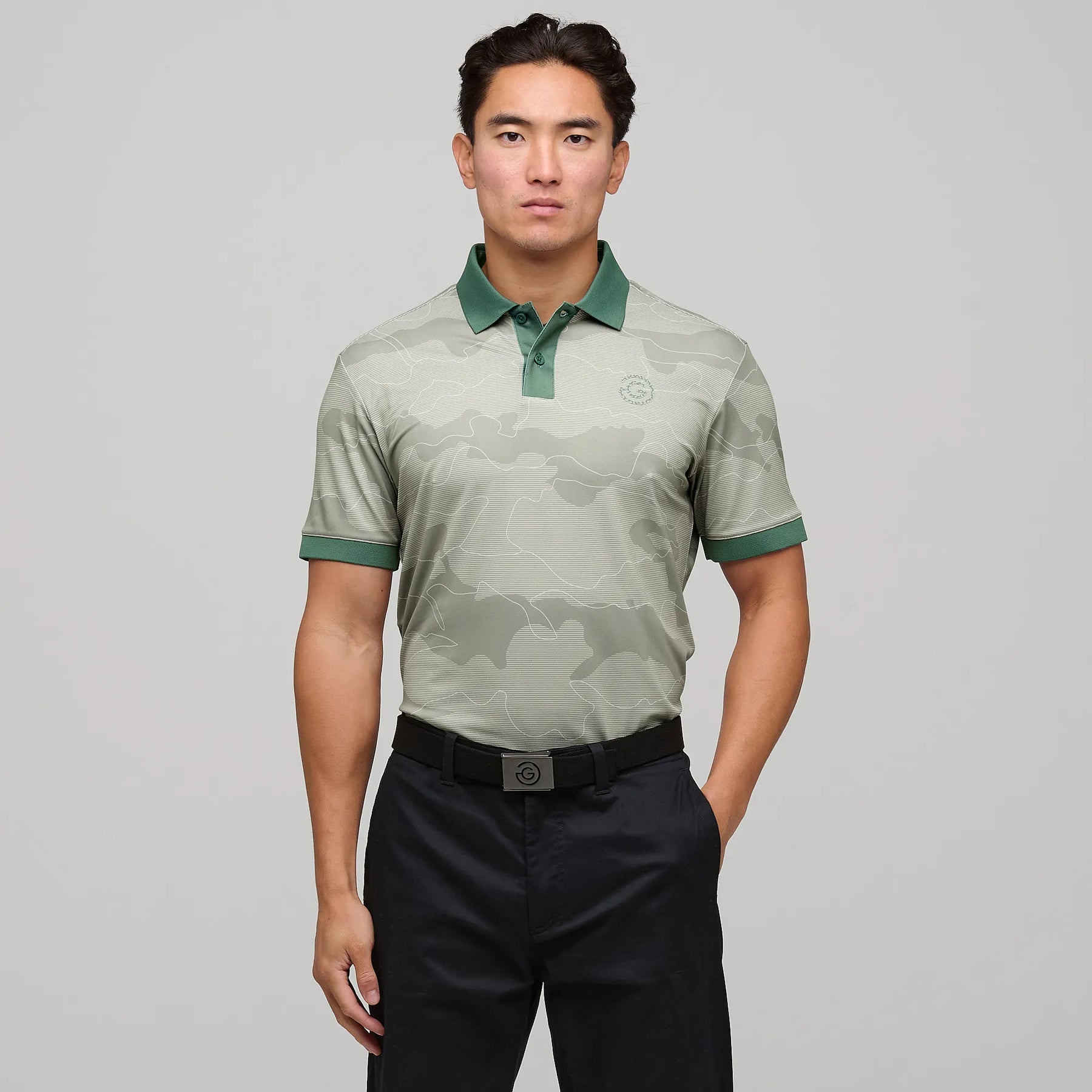 Mixing a large scale camouflage print with a map-inspired line drawing overlay, Monroe is a lightweight, breathable golf polo shirt with a ribbed collar and cuffs. Made for golf but inspired by urban life, this is a shirt designed for everyday life.