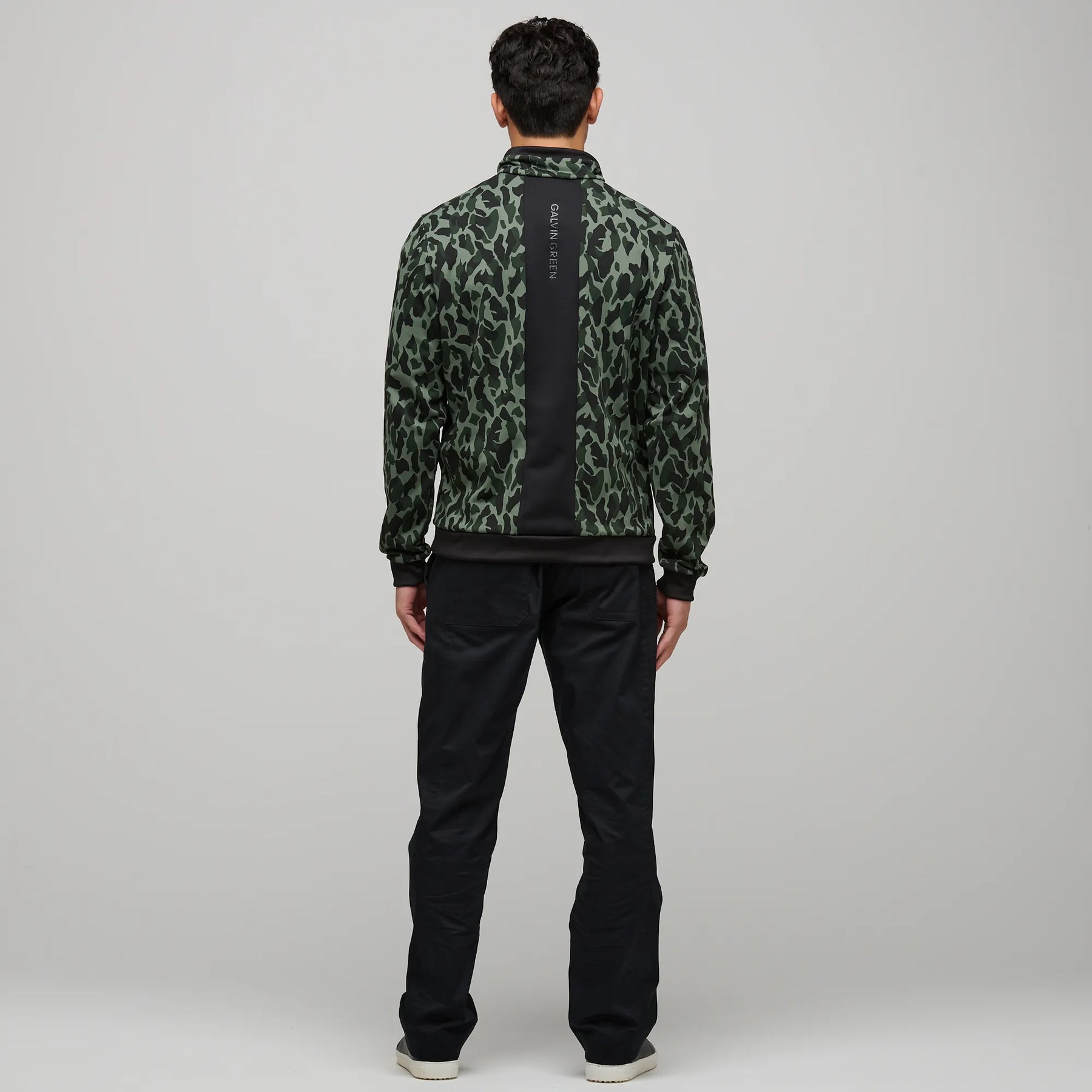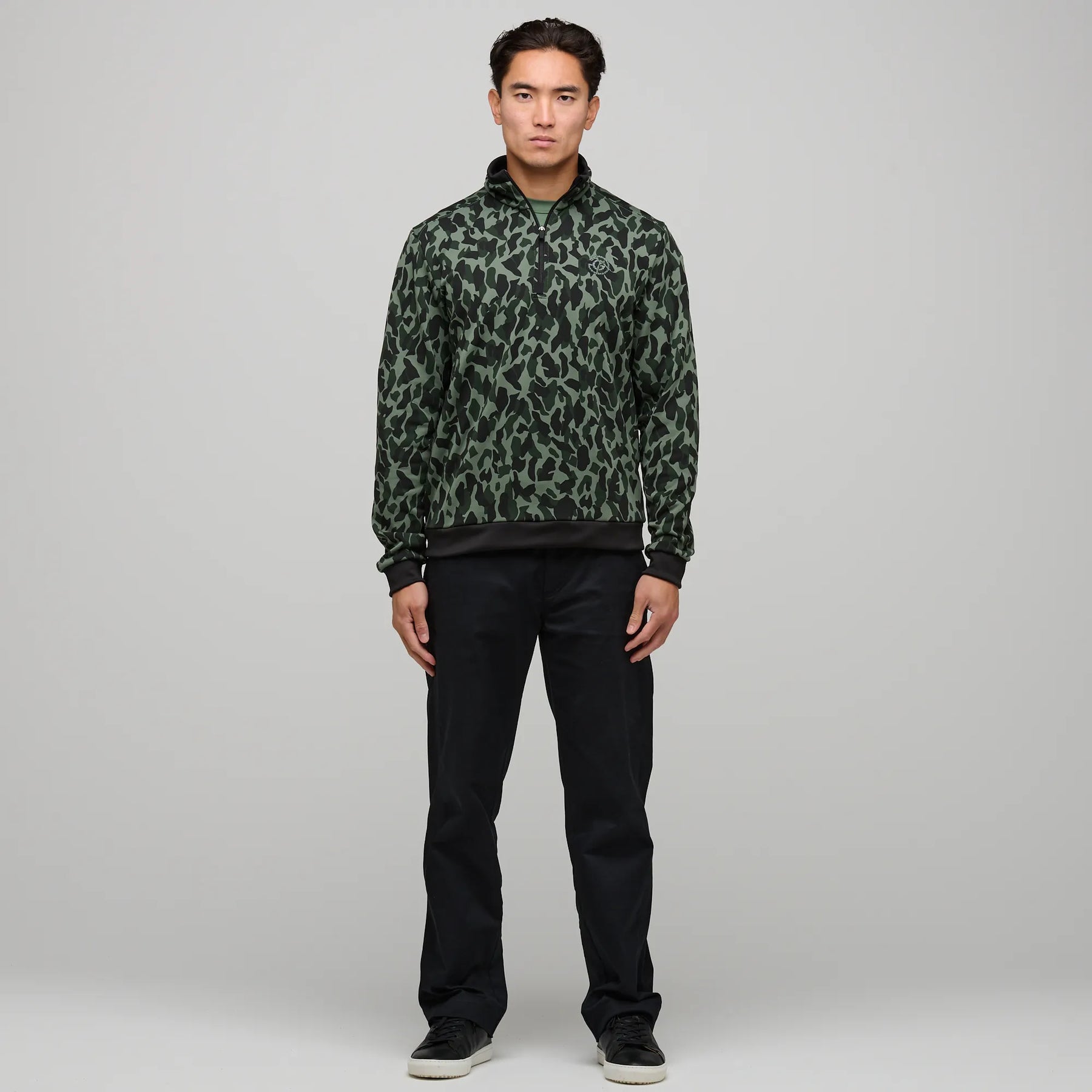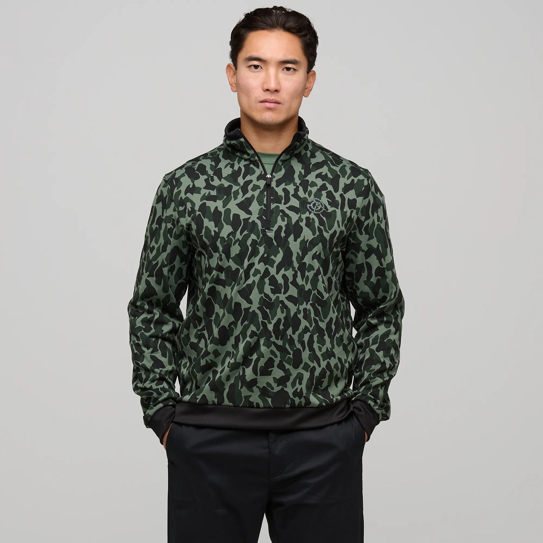 The Duncan INSULA™ half zip features a white, grey, and greige camouflage print with black ribbed trim on the cuffs, hem, and collar. Designed for the golf course but versatile enough for urban settings or outdoor adventures, Duncan has a front chest logo and a centre back panel printed with the brand name.