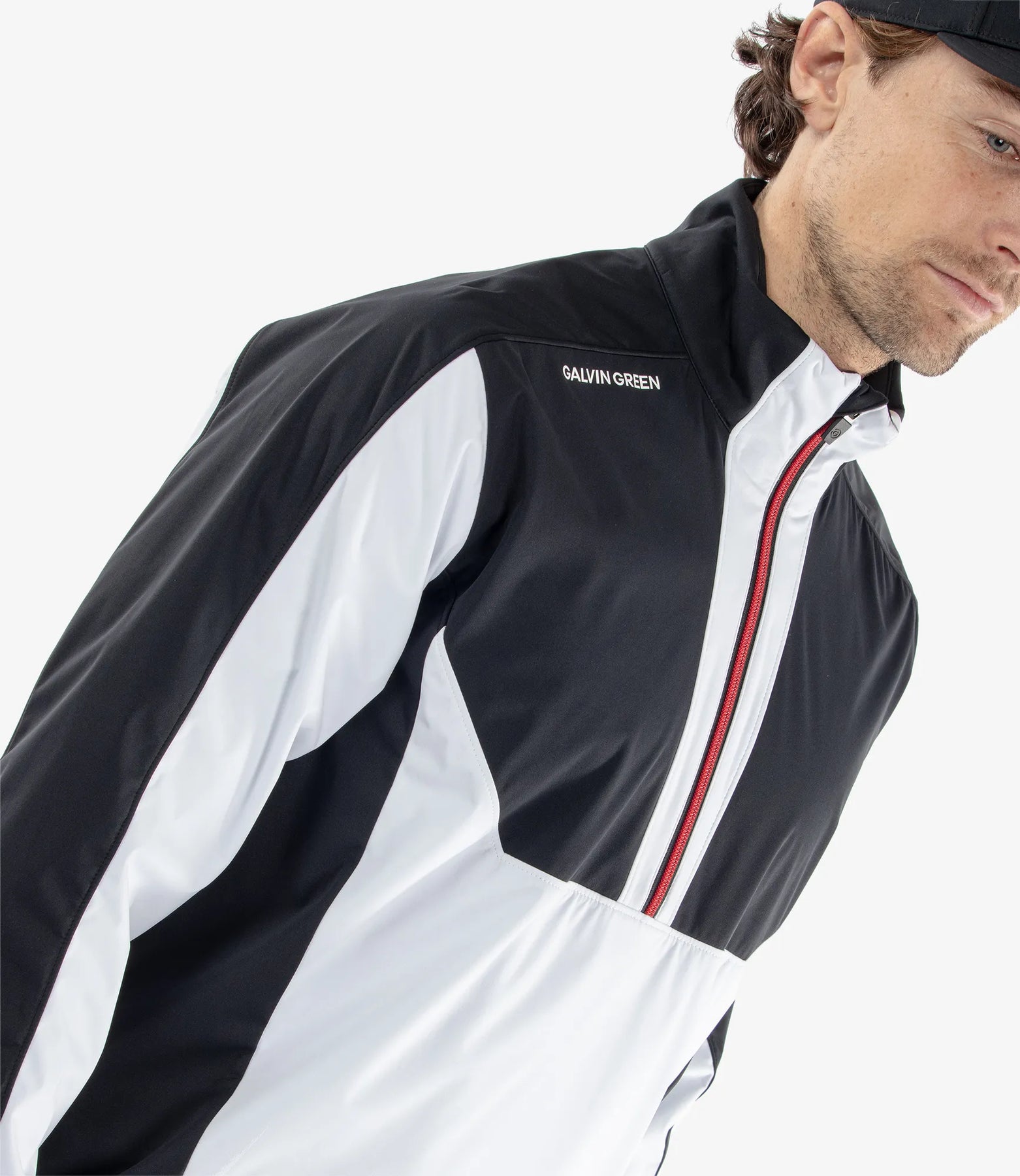 Lawrence is a men’s two tone golf jacket from Galvin Green’s INTERFACE-1™ range — a collection of high tech performance golf outerwear designed for cold, windy days on the golf course. Made from a windproof recycled polyester fabric that has a water repellent finish, this half zip jacket is stretchy, extremely breathable, and provides thermal insulation.