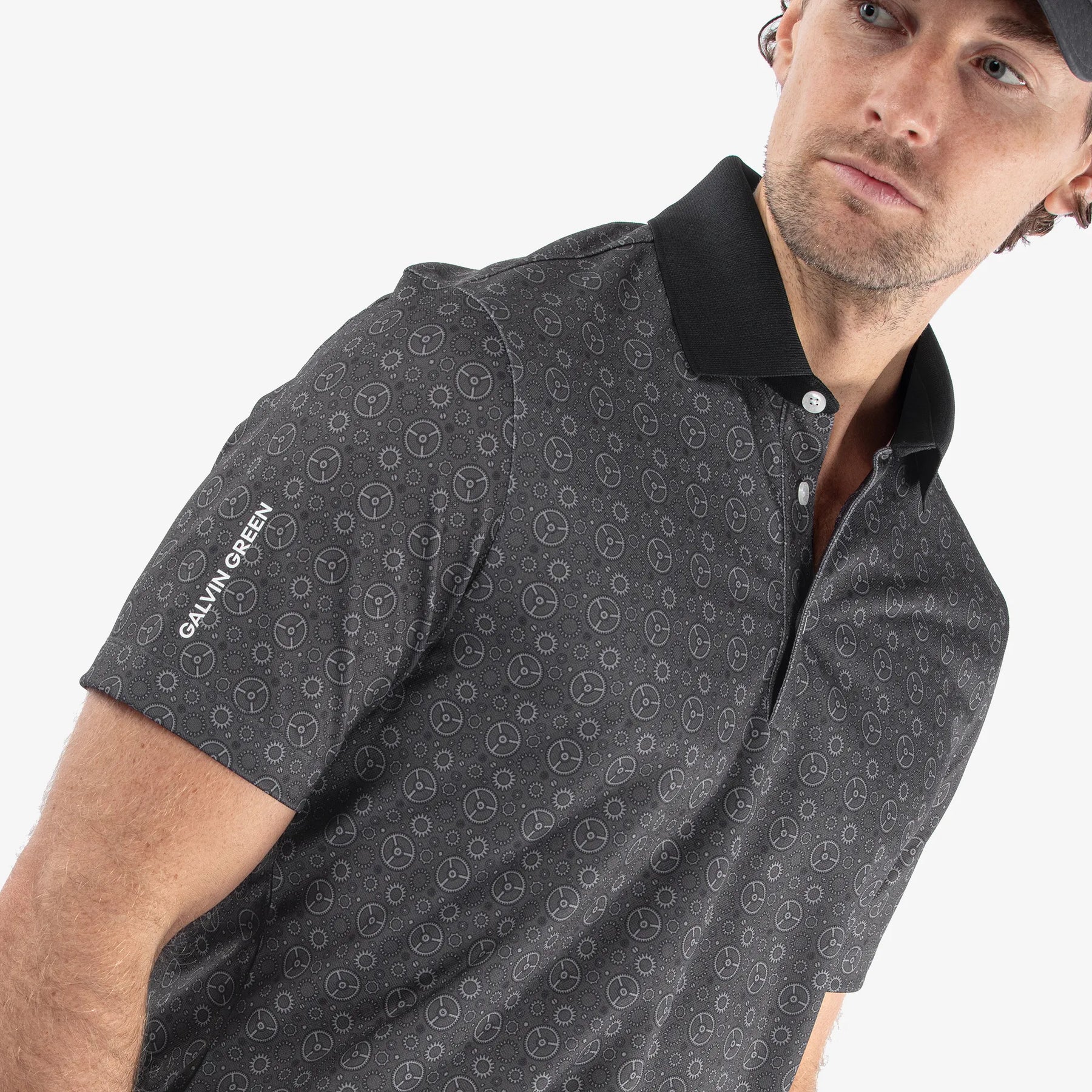 Upgrade your golf wardrobe with Miracle, a short sleeve VENTIL8™ PLUS shirt with an all-over print of mechanical wheels and gears. This polished shirt has a contrasting knitted collar and a partially enclosed placket, only the top button is visible. Made from a high-tech shirting that offers UV protection of 20+, this shirt offers extra cover from the sun on hot days.