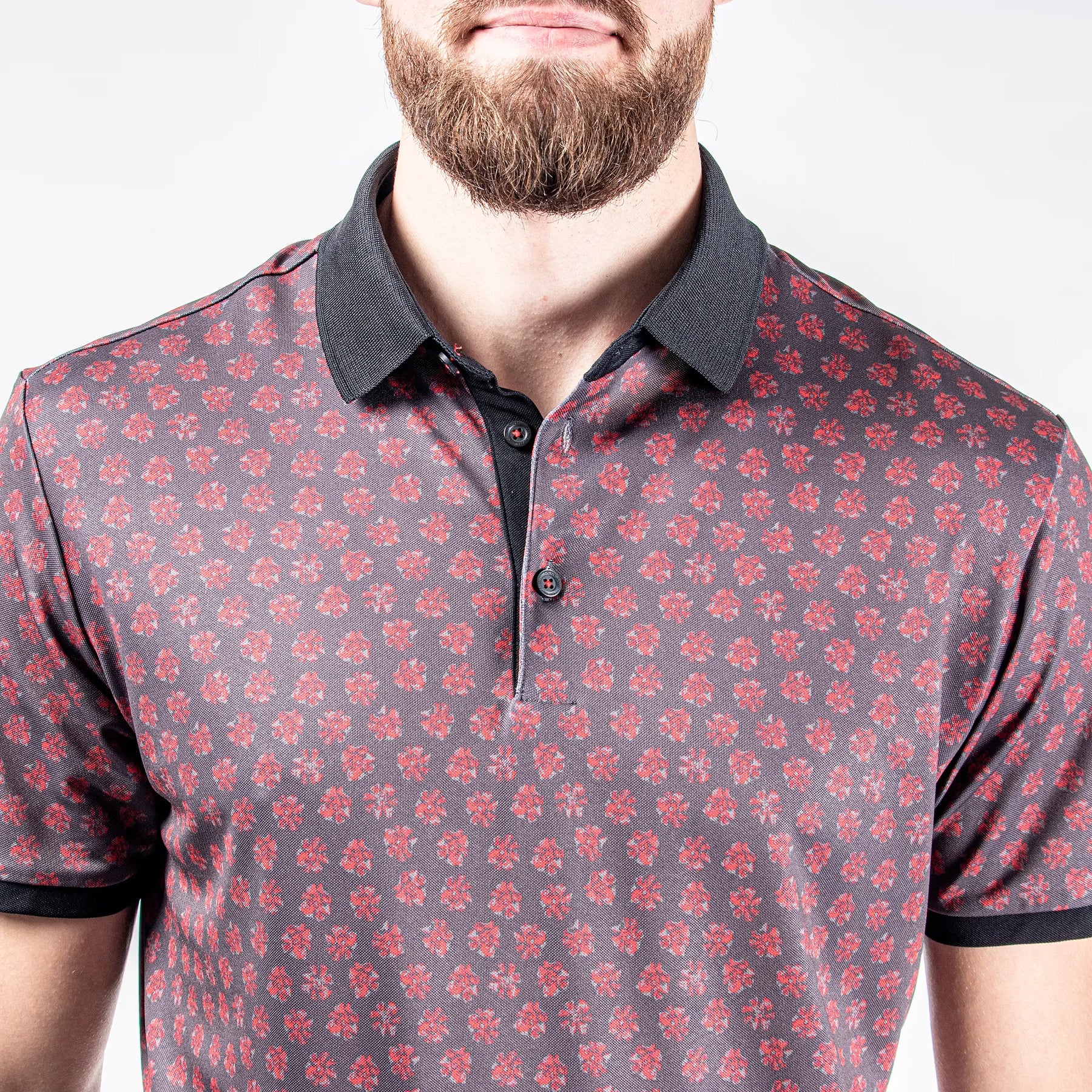 Murphy is a breathable short sleeve polo shirt with an allover floral print and contrasting ribbed knit collar, placket, and cuffs. Galvin Green’s VENTIL8™ PLUS golf shirt range is a high-tech collection of performance driven shirts designed to be functional and stylish. The Murphy shirt is made from an extremely breathable fabric that is quick dry, ensuring you are comfortable on the golf course when it’s hot outside.